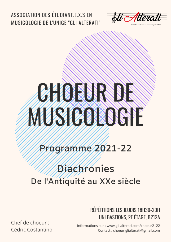 Les répétitions se tiendront les jeudis de 18h30 à 20h dès le 7 octobre 2021 en salle de musicologie (B212a).
